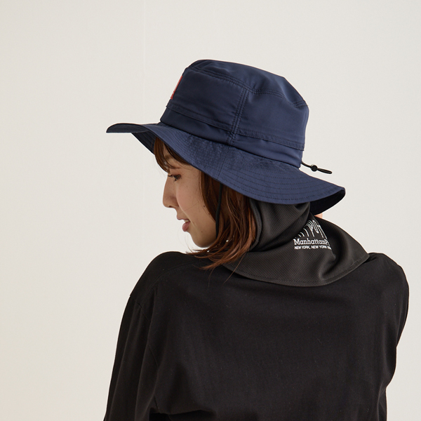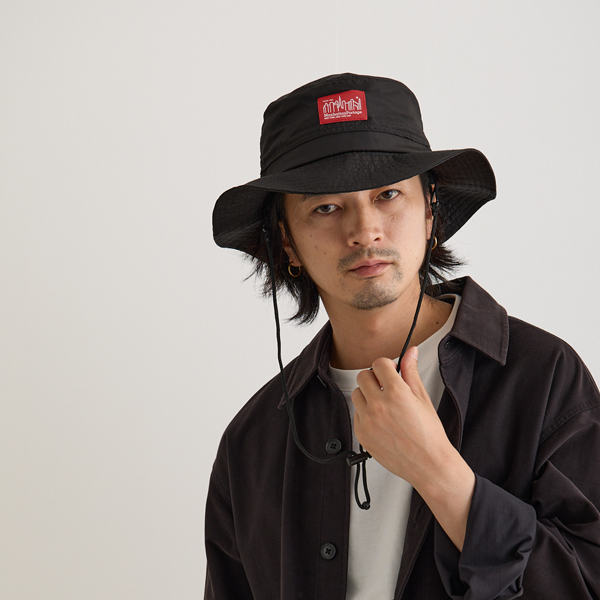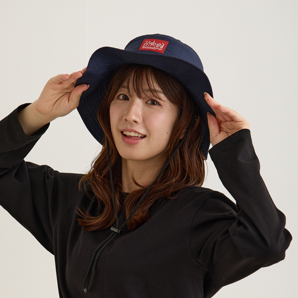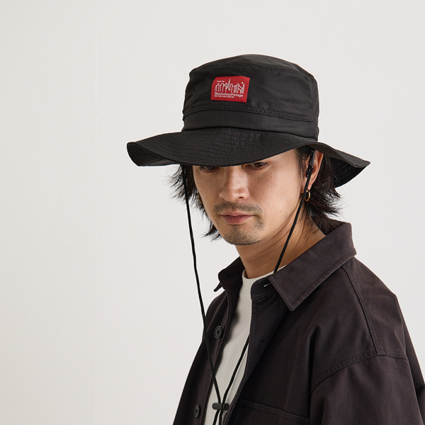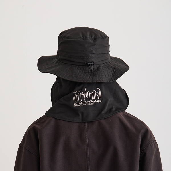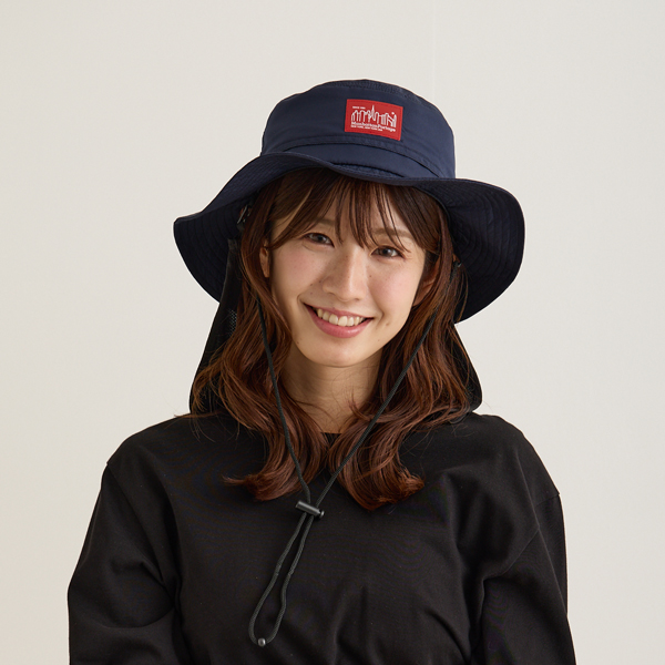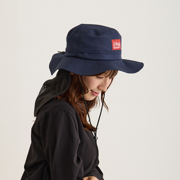 マンハッタンポーテージ(Manhattan Portage)のアドベンチャーハットです。サラリとした質感のポリエステル100%の生地で軽くて水や雨に強いのが特徴です。(防水ではございません)内側のn裏地にはメッシュ生地がついていて通気性がよく蒸れにくい構造です。後ろはたれ付きで紫外線を防止し、日よけになります。アゴ紐付きで取り外しも可能。洗濯も手洗いできます。サイズはバックのゴムでサイズ調節できてフリーサイズ(56cm~58cm推奨)です。縦33cm×横33cm×高さ14cm。カラーはブラックとネイビーの2色。
