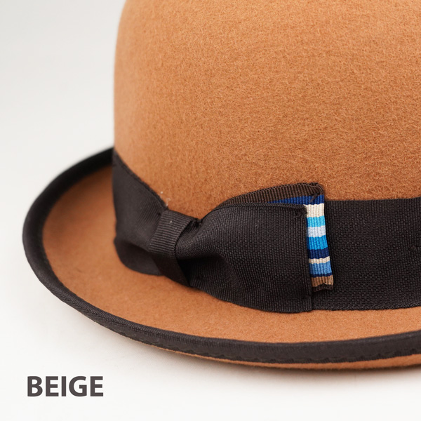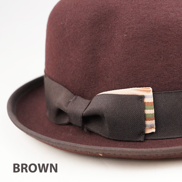 ウールフェルトで作成した定番のグログラン巻きボーラーハット。ちらりと見える配色リボンがお洒落です。ベーシックな形で、2サイズあり、カラー展開も豊富なおすすめハット。スベリ部分の紐でサイズ調整も可能です。【素材】毛100%。【頭回り】58(56cm~58cm推奨)、60(58cm~60cm推奨)。【帽子の大きさ】縦28cm×横26cm×高さ12cm。【つばの長さ】4cm。 #メンズ #レディース #10代 #20代 #30代 #40代 #50代 #60代 #70代 #秋 #冬 #ボーラーハット #ボーラー #丸い #ダービーハット #フェルトハット #黒 #ブラック #グレー #ベージュ #ネイビー #紺 #ブラウン #茶 #紳士 #スーツ #ステージ #ダンス #カラオケ衣装 #ハット #帽子